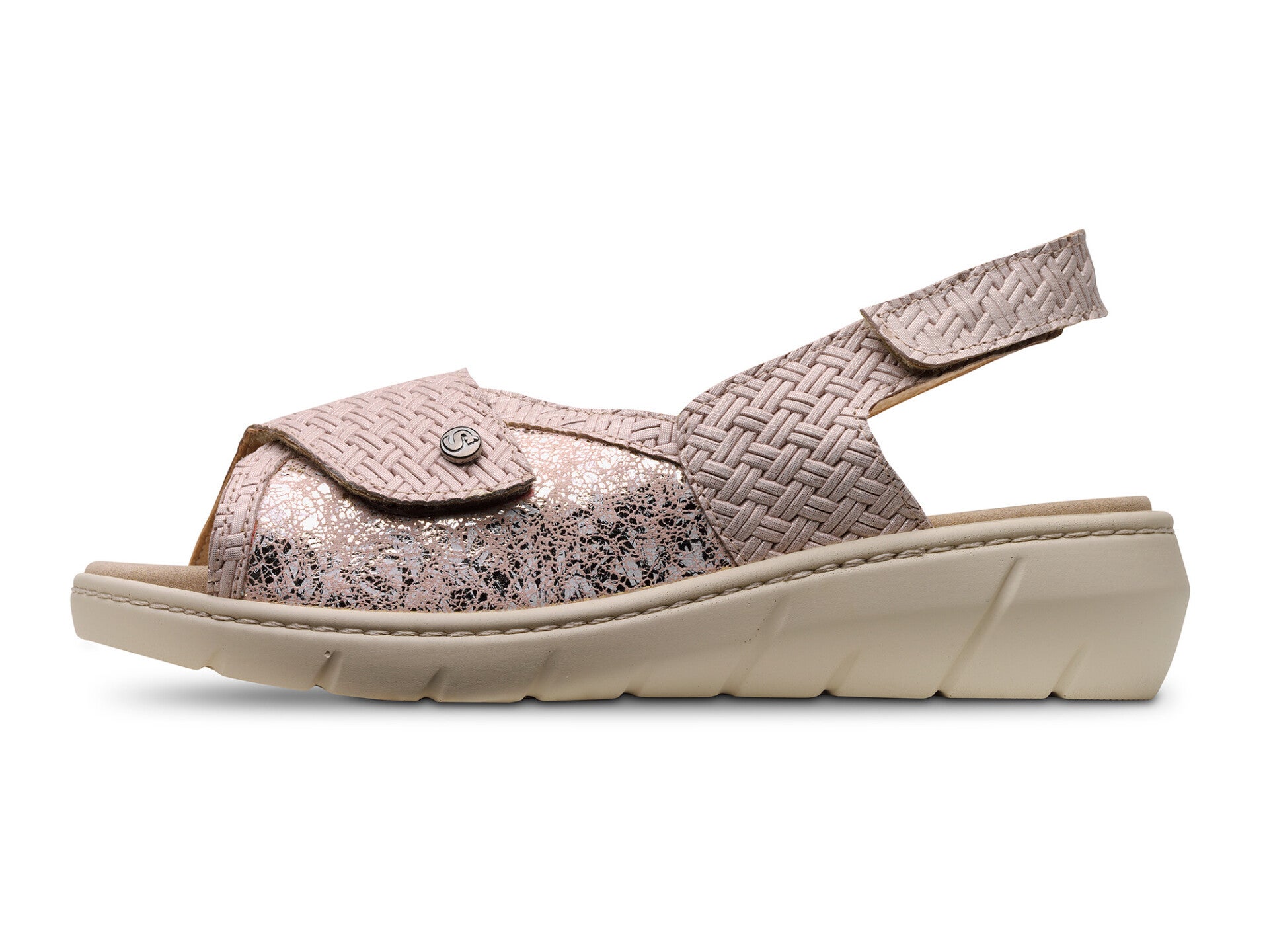 Sandalia diseñada especialmente para pies delicados y sensibles, que incorpora juanetera de material elástico para hallux valgus (juanetes). Este material se adapta a la deformación del pie sin generar presiones ni roces, ayudando a aliviar las molestias durante la marcha.