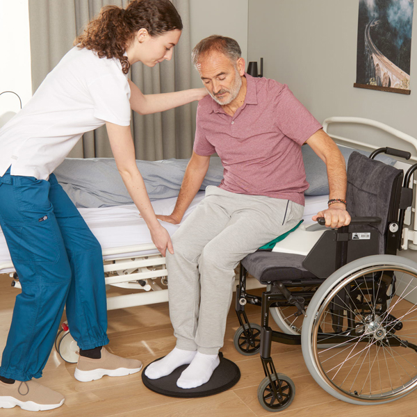 Este disco de transferencia cuenta con un sistema de rotación de 360° de baja fricción, que reduce el esfuerzo del cuidador y mejora la estabilidad del usuario durante los movimientos de cambio de posición.